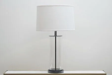 Classic Ralph Lauren inspired glass and bronze cylinder lamps. Available in two sizes, standard (89 h x 52 w cm) and oversized (89 h x 52 w cm). Fine Chocolate leather trim detail optional for base of shade. Stand alone or pair the lamps to make a stunning impact
