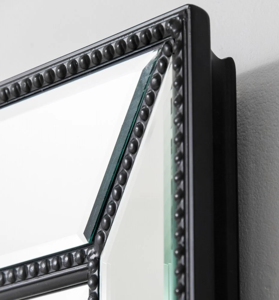 Wall Mirror with bevelled mirrored border panels and black beaded trim. Total dimensions (97w x 122h cm) also available in a Wall leaner option (80w x 185l cm)